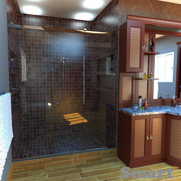 The double sliding shower door with one fixed glass is used mainly at very small openings from 0,85m until 1,25m, where the two sliding panels open both to the same side, behind the fixed glass. This creates the biggest clear opening from all the other sliding systems. The waterproofing of the sliding panels is achieved by using special angle profiles.