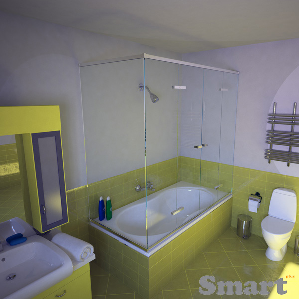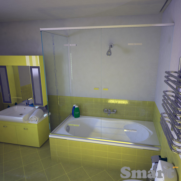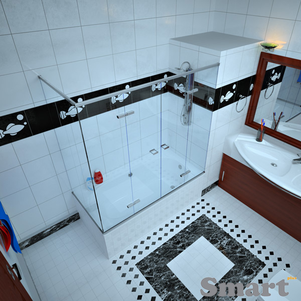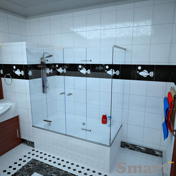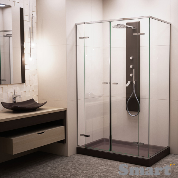 Η δίφυλλη γωνιακή καμπίνα μπάνιου με τρία σταθερά κρύσταλλα είναι ιδιαίτερη κατασκευή, που χρησιμοποιείται σε μεγάλα σε μήκος μπάνια που έχουν σταθερό δομικό υλικό μόνο στην μια πλευρά της μπανιέρας. Αυτή η καμπίνα μπάνιου διαθέτει δύο ανοιγόμενες πόρτες και τρία σταθερά κρύσταλλα ασφαλείας 10mm.